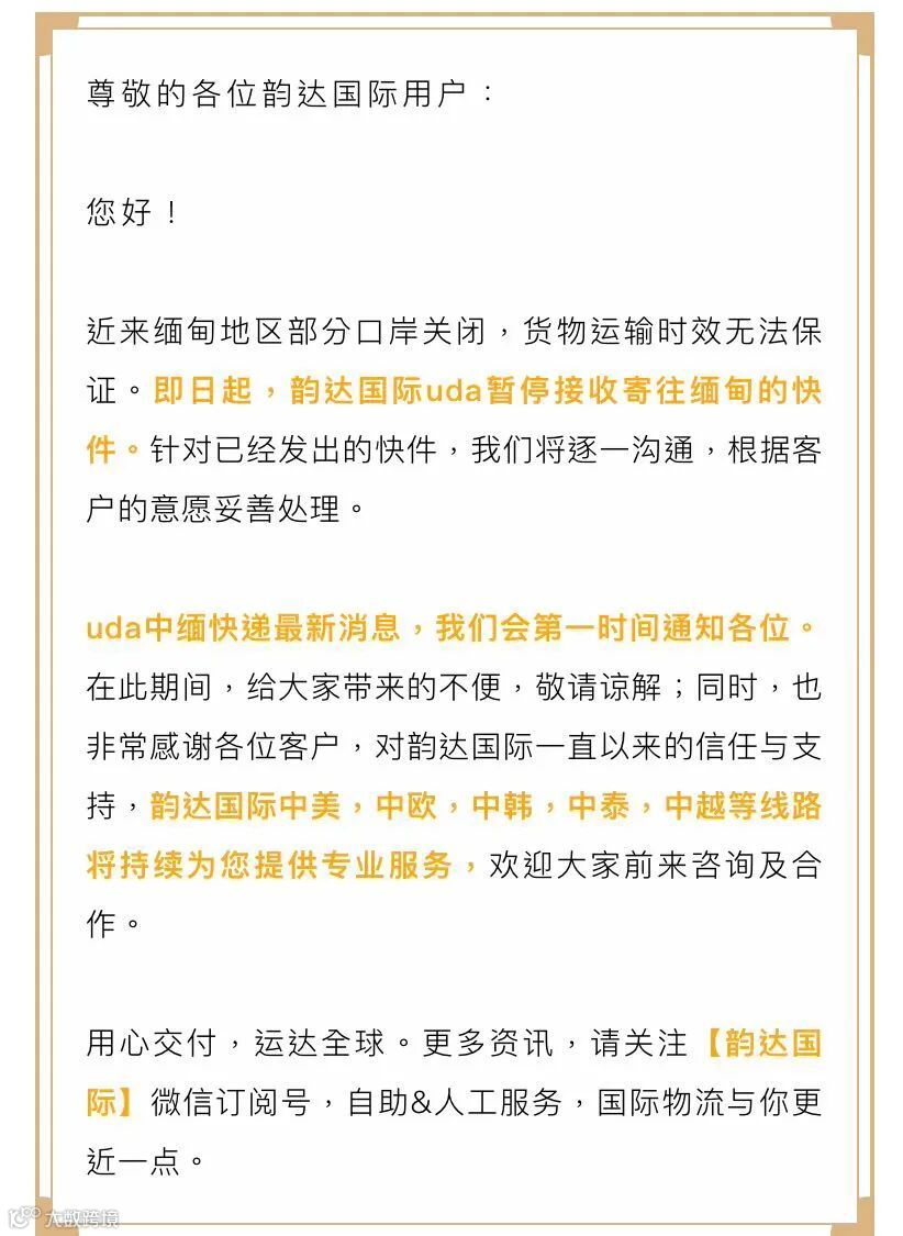 2月3日,韵达国际发布《关于临使调整寄递缅甸快件的通知》,据《通知》显示,由于近来缅甸地区部分口岸关闭,货物运输时效无法保证。即日起,韵达国际暂停接收寄往缅甸的快件。针对已经发出的快件,韵达国际将逐一沟通,根据客户的意愿妥善处理。(物流时代周刊)