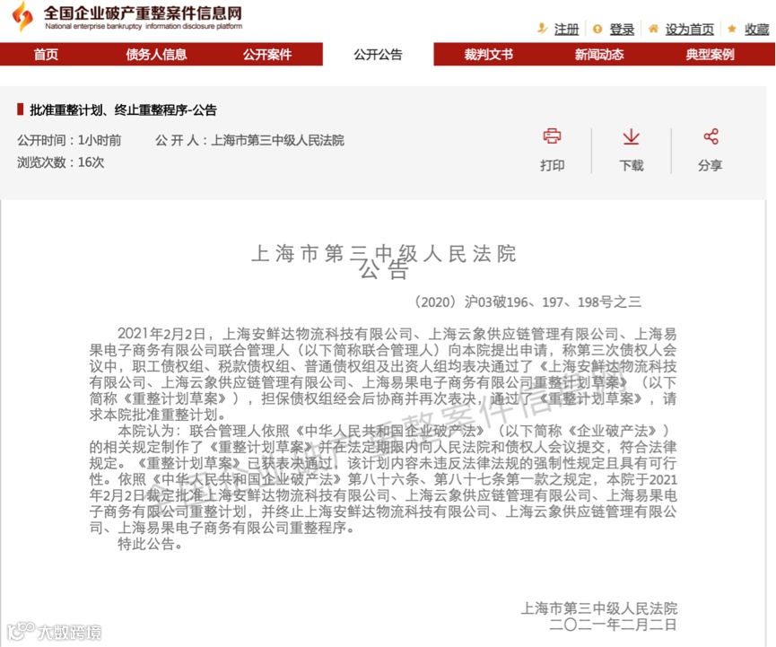 据“全国企业破产重整案件信息网”披露:2021年2月2日 ,“上海安鲜达物流科技有限公司”、“上海云象供应链管理有限公司”、“上海易果电子商务有限公司”联合管理人(以下简称“联合管理人”)已向上海市第三中级人民法院提出申请,称三次债权人会议中,职工债权组、税款债权组、普通债权组及出资人组均表决通过了《上海安鲜达物流科技有限公司、上海云象供应链管理有限公司、上海易果电子商务有限公司》(以下简称《重整计划草案》),担保债权组经会后协商并再次表决,通过了《重整计划草案》,请求上海市第三中级人民法院批准重整计划。(晟道投资)
