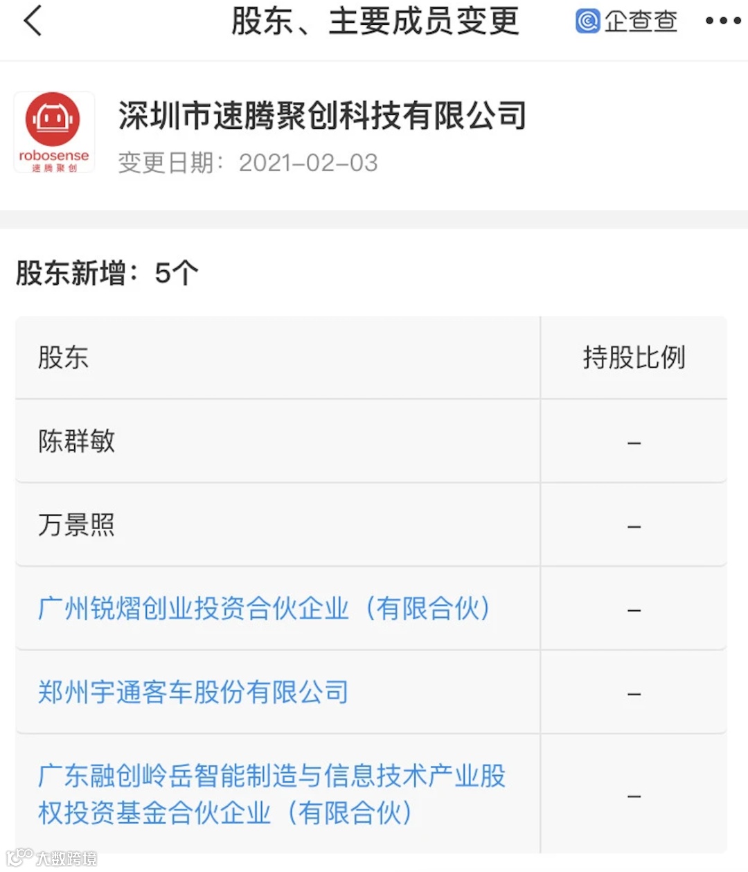2月1日,深圳市速腾聚创科技有限公司(速腾聚创)发生工商变更,新增股东广东融创岭岳智能制造与信息技术产业股权投资基金合伙企业(有限合伙)(简称广东融创)等机构,企查查股权穿透显示,TCL科技为广东融创股东之一,出资比例达36.95%。企查查显示,速腾聚创成立于2014年,注册资本约1628万元,法定代表人为邱纯鑫,经营范围含物联网、智能化相关产品的研发;智能机器人、智能芯片和智能控制技术的开发等。企查查融资信息显示,速腾聚创完成3亿元融资,投资方包括菜鸟网络、北汽等。(企查查)