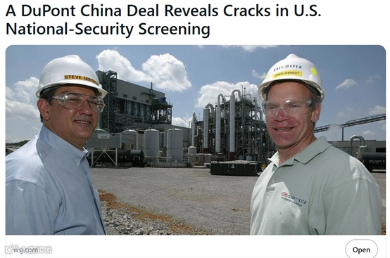 2023年8月14日,《华尔街日报》报道:杜邦公司与中国公司的一项交易涉嫌暴露了美国国家安全审查的漏洞。美国国防部认为杜邦在与华峰公司的交易过程中,可能存在关键技术泄露的风险,目前美国联邦调查局(FBI)已经介入调查。