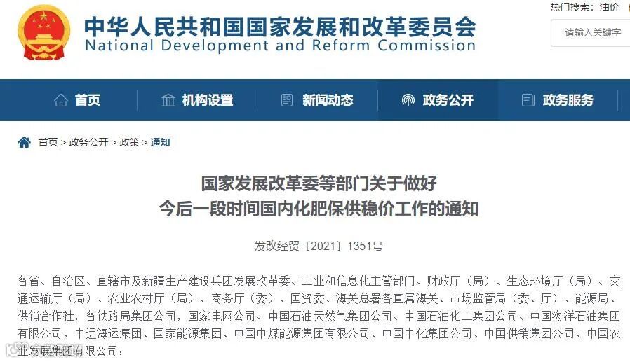化肥是重要的农业生产资料,是农业生产和维护国家粮食安全的重要物资。针对今后一个时期化肥市场面临的新形势、新问题,为保障化肥市场供应和价格基本稳定,国家发展改革委、工业和信息化部等13部门近日联合下发《国家发展改革委等部门关于做好今后一段时间国内化肥保供稳价工作的通知》(发改经贸〔2021〕1351号)(以下简称《通知》),要求各地和有关中央企业采取有力措施,做好今后一段时间国内化肥保供稳价工作。