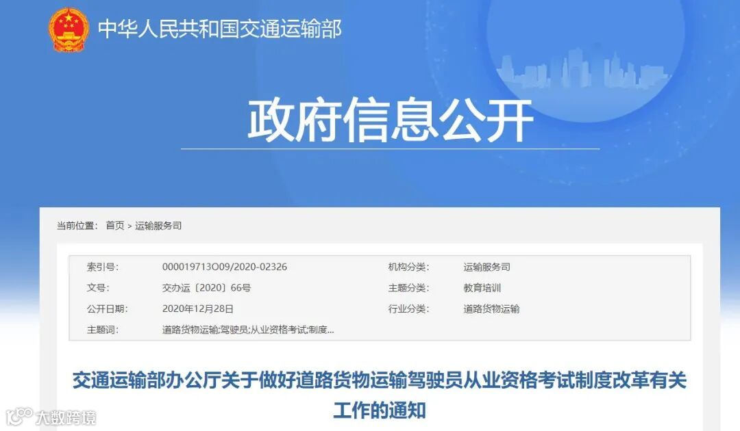 昨天(12月28日),交通运输部办公厅印发《关于做好道路货物运输驾驶员从业资格考试制度改革有关工作的通知》(简称《通知》),提出自2021年3月1日起,各地交通运输主管部门不得再组织开展除道路危险货物运输以外的道路货物运输驾驶员从业资格考试,驾驶员凭《机动车驾驶员培训结业证书》和相应车型的机动车驾驶证申领道路货物运输驾驶员从业资格证件。此举旨在贯彻落实《国务院办公厅关于进一步优化营商环境更好服务市场主体的实施意见》部署要求,方便道路货运驾驶员从业、就业、择业。