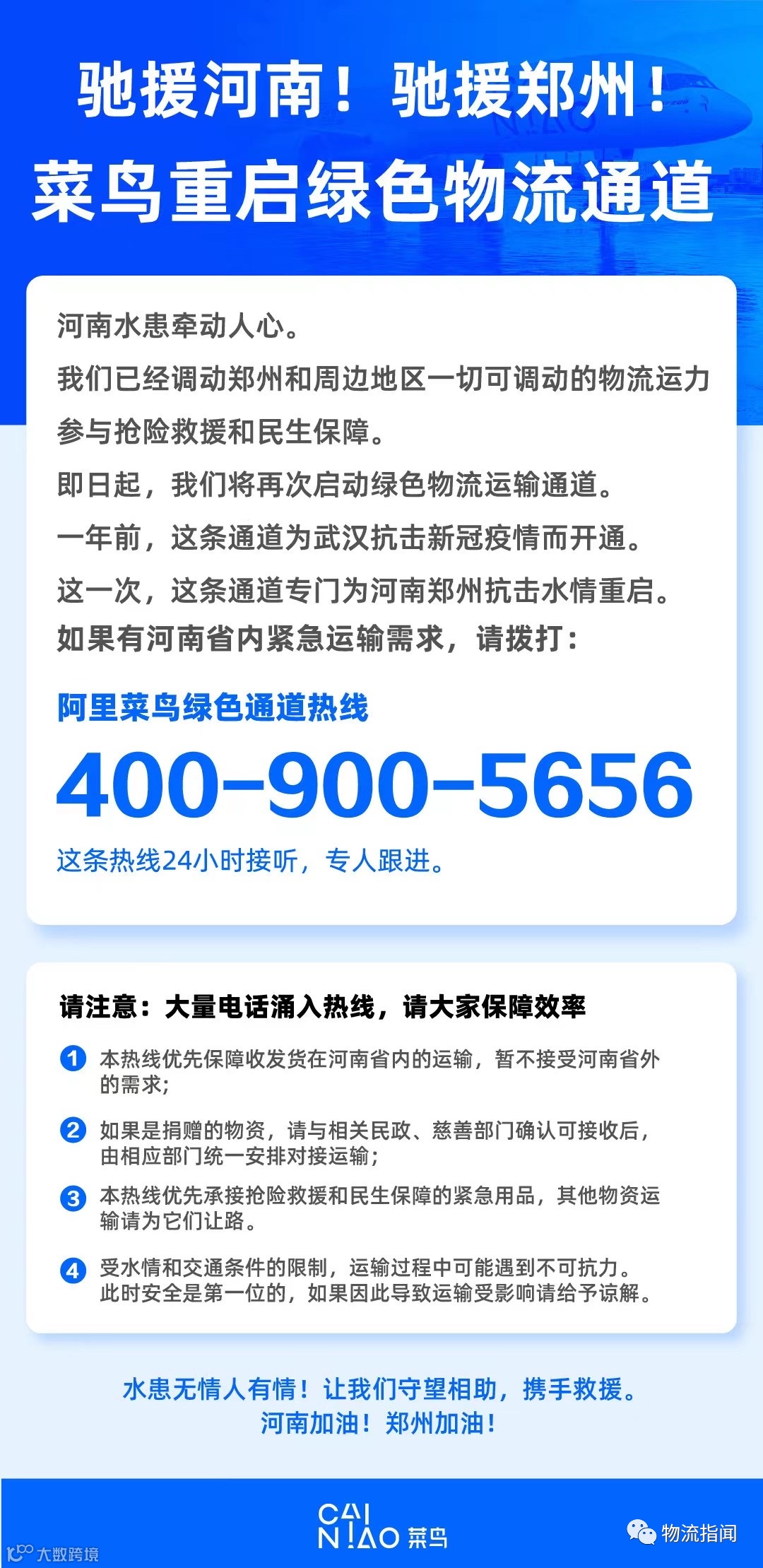 同日,菜鸟宣布,将面向河南省内运输启动物流绿色通道,开展紧急救援运输。该通道将首先保障抢险物资和民生紧急用品的运输,一旦接下任务,将免费送达。河南省内各界有相关需要可以拨打菜鸟绿色通道热线400-900-5656,该热线24小时接听,专人跟进。考虑到当前河南地区的运输需求量大。菜鸟绿色通道将优先保障河南省内的运输,即收发货都在河南的需求优先,暂不接受河南省外的运输需求。运输物资也优先承接抢险救援和民生保障的紧急用品,其他物资运输请为它们让路。