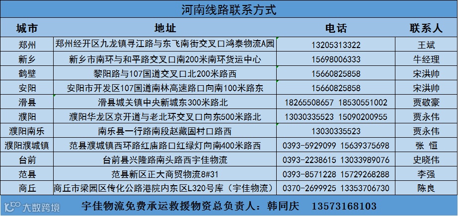 当地企业宇佳物流宣布,从即日起,将免费承运河南暴雨灾区的救援物资!免费承运线路包括郑州、安阳、鹤壁、商丘、新乡、濮阳南乐、台前、范县等地。以下是各条线路联系人和联系方式。