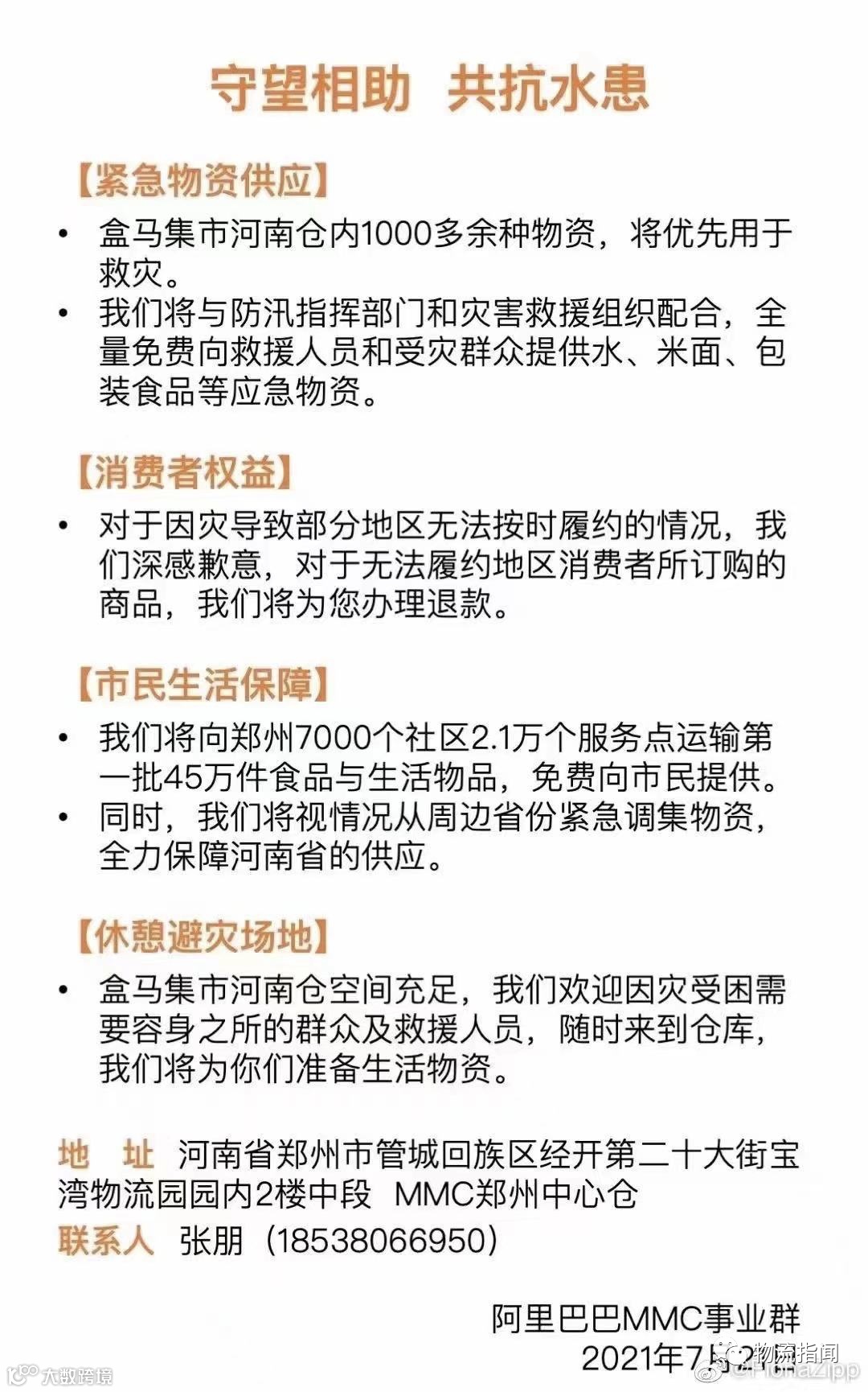7月21日,阿里巴巴宣布,阿里巴巴公益基金会将捐助人民币1亿元,马云公益基金会也将捐助人民币5000万元,配合河南省政府指挥,用于救灾紧急举措和灾后恢复工作。菜鸟正调度一切可调度的物流力量支持救灾物资运输。已经动员郑州当地有条件的菜鸟驿站,和社区对接,为社区居民提供力所能及避雨、饮用水等支持;受灾情影响,郑州地区的包裹配送将出现不同程度的延迟。已经要求一线配送员安全作业,不要涉险,也恳请消费者给予谅解。MMC河南分公司向郑州市7000个社区,2.1万个团点,免费提供首批45万件蔬菜、粮油等生活日用品。