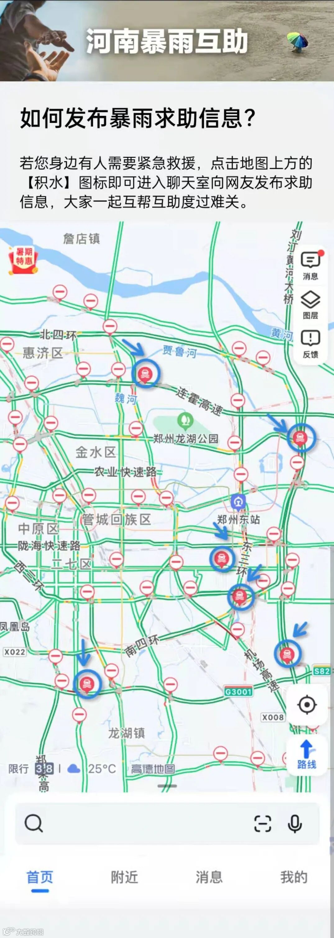 高德发布“河南暴雨积水地图”,河南当地的用户直接点击地图上的“积水点”图标,就能进入相关聊天室,发布求救信息,并获得救援队电话、避难场所位置等即时资讯。