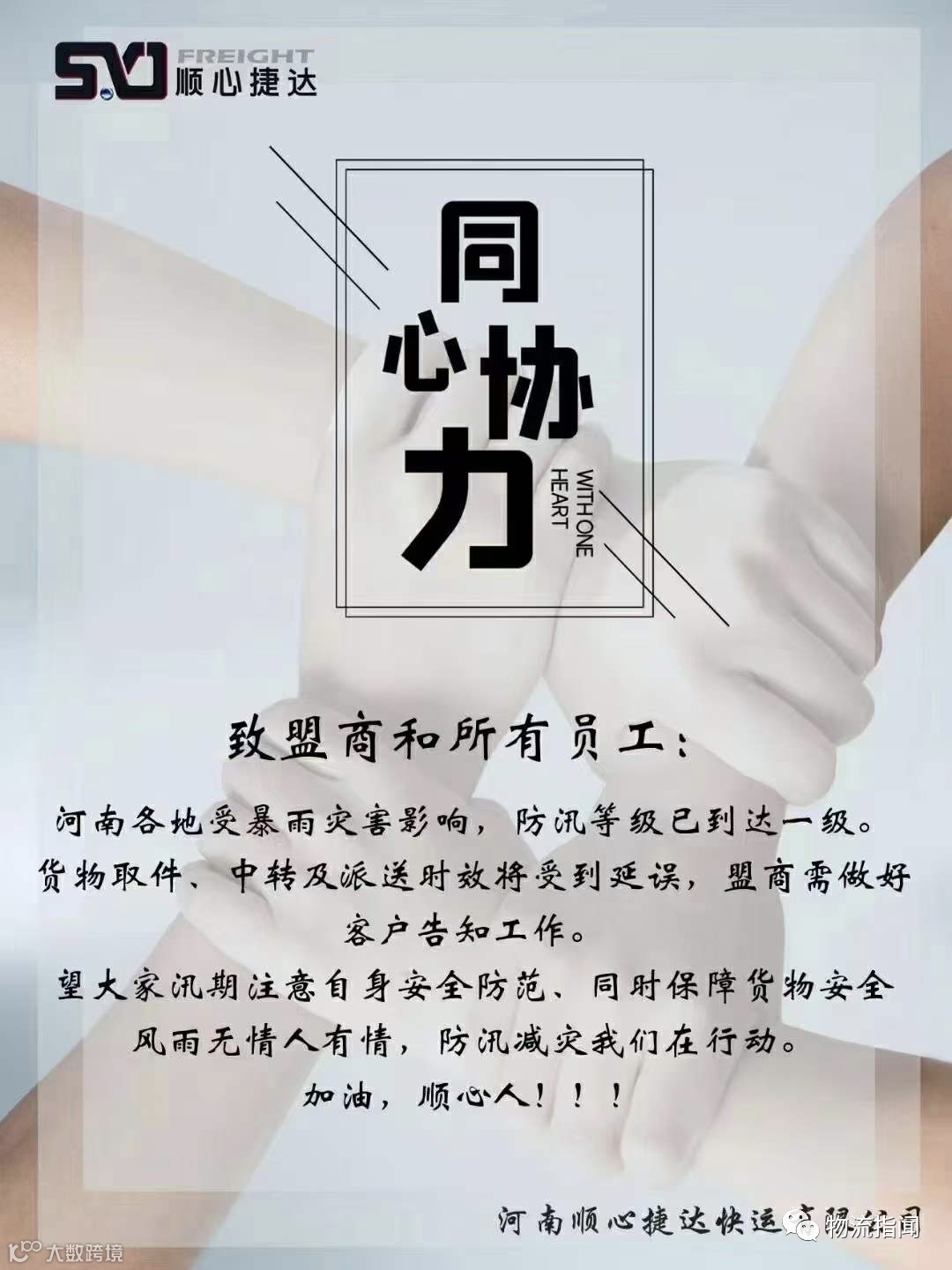 快运公司,如河南顺丰捷达也内部告知加盟商及员工,货物取件、中转及派送时效将受到延误,加盟商需做好客户告知工作。顺心捷达总部也发布告客户书表示,会密切关注天气变化,积极配合政府的防汛工作,及时妥善调整各项服务工作,期间货物到达时效延误带来的不便之处敬请谅解。