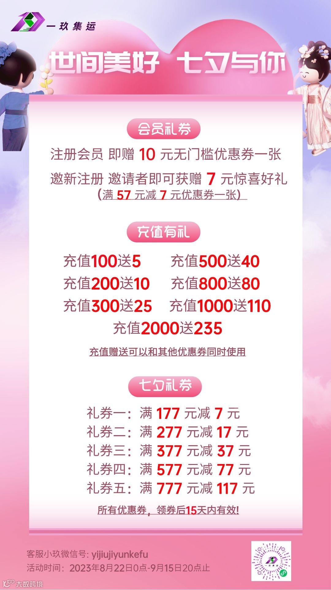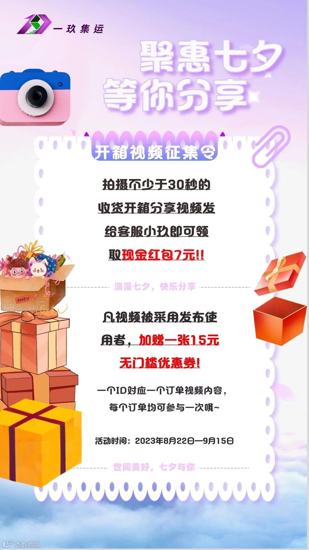 转发一玖集运视频号发布的任一“客户开箱分享视频”到自己的朋友圈/视频号并集赞7个,即可获赠:一张7元无门槛优惠券。
