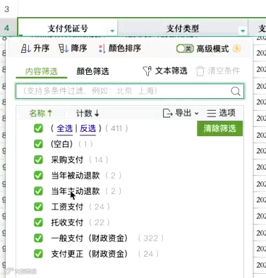 5、对账里面的常规支付:对应的是金财导出支付表里的”支付类型”,比如一般支付、采购支付、工资支付、托收支付,这些归为常规支付;支付更正:属于垫支情况,比如老师年初的时候他支出有可能是30216的指标还没有下来,是先用了30399指标垫支,等到30216指标下来以后,老师再把他改成需要用的指标,就会涉及支付更正,会涉及一正一负。