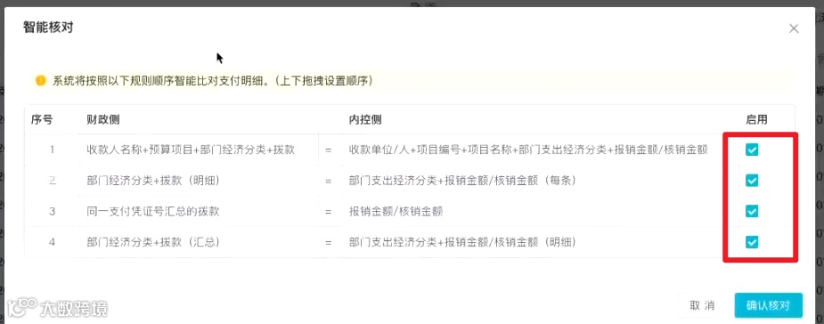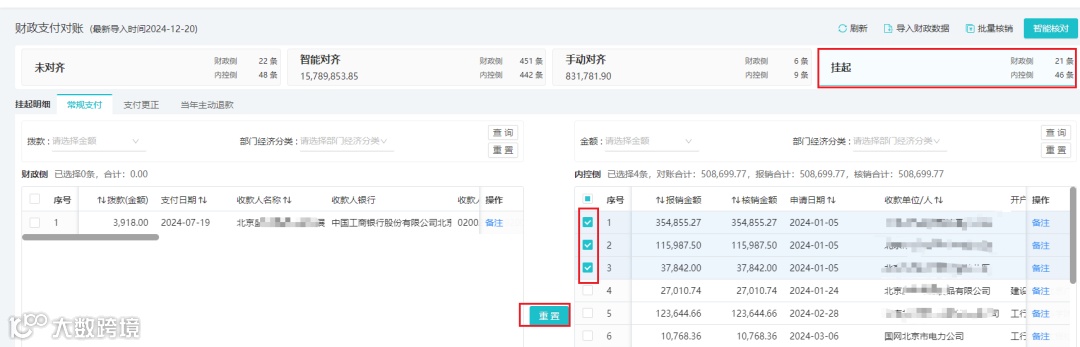 6、执行对账之后,支持勾选财政侧,内控侧也会对应自动勾选。