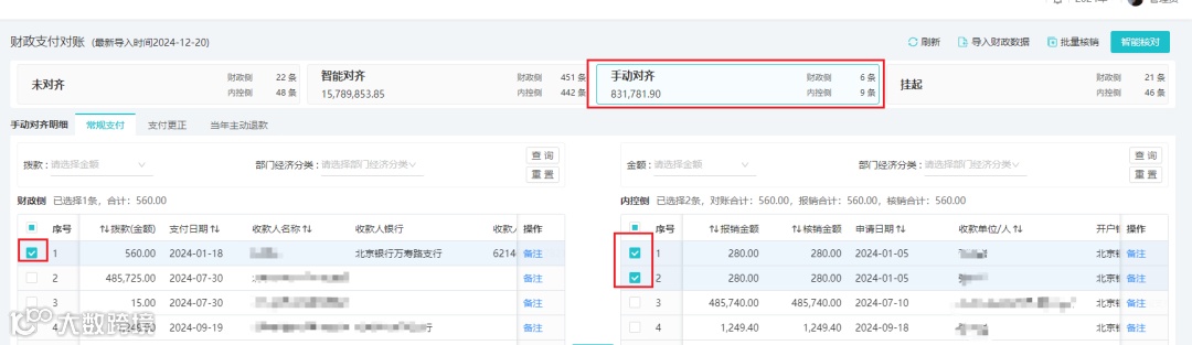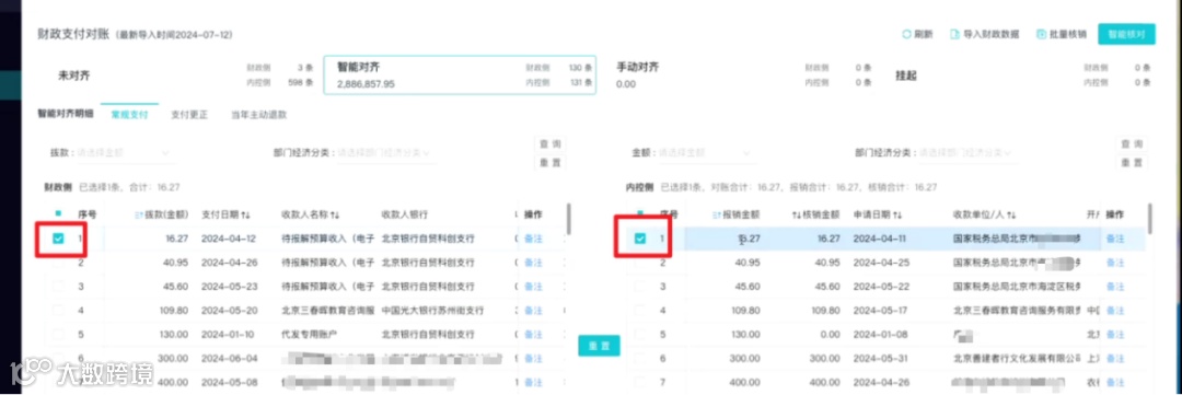 这个功能主要是解决内控易系统报销单的支付明细和金财实际支付明细之间对齐的一个功能,通过将内控系统的报销单明细与财政支付明细进行自动比对,能够及时发现两边数据是否存在差异,避免人工核对可能出现的疏漏和错误,确保财务数据的准确性和一致性。
