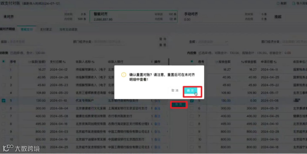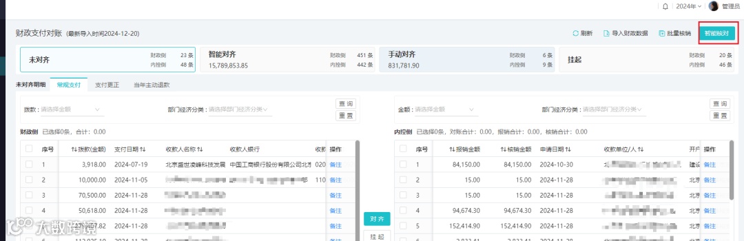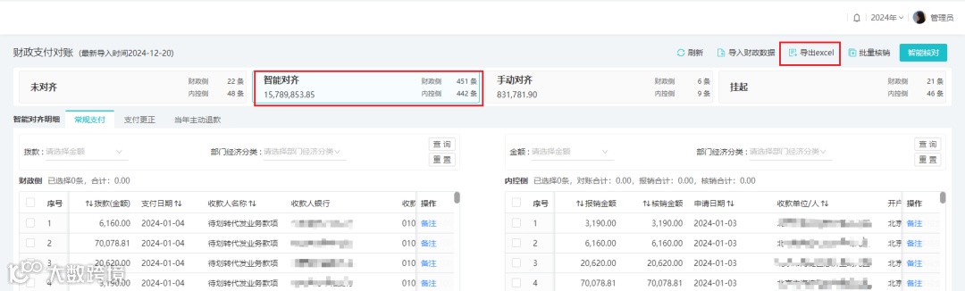 在未对齐页面,系统能够显示出未对齐的财政侧支付明细和内控侧支付明细,财务老师可以直接查看相关明细,快速查明差异原因,如金额错误、科目不一致、付款人名称、付款人银行、付款人银行账号有问题等,而无需像以前那样花费大量时间去查找问题所在。