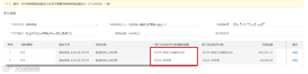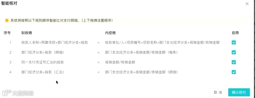 1、第一条就是最细的维度对账规则:财政的收款人名称、账号、收款人信息、开户银行等+预算项目+部门经济科目+支出的金额==内控的收款人名称、账号、收款人信息、开户银行等+(项目名称+部门经济科目=财政指标)+报销金额/核销金额。
