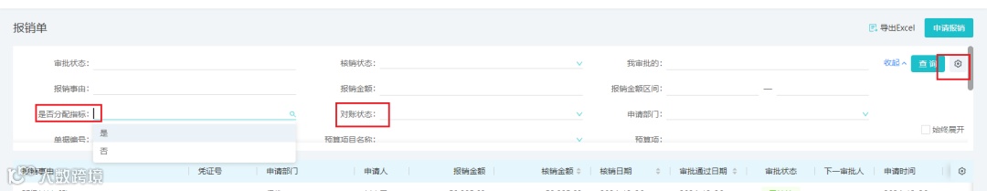 3、建议在核对之前检查一下,内控易的报销单有没有都关联上指标了,因为对账有一个规则是:报销单已经审批通过且有匹配好分配的指标,才会进入到对账的“内控侧”,也可以在报销单筛选功能添加“对账状态”、“是否分配指标”,就能快速筛选出来哪些是没有关联指标的。