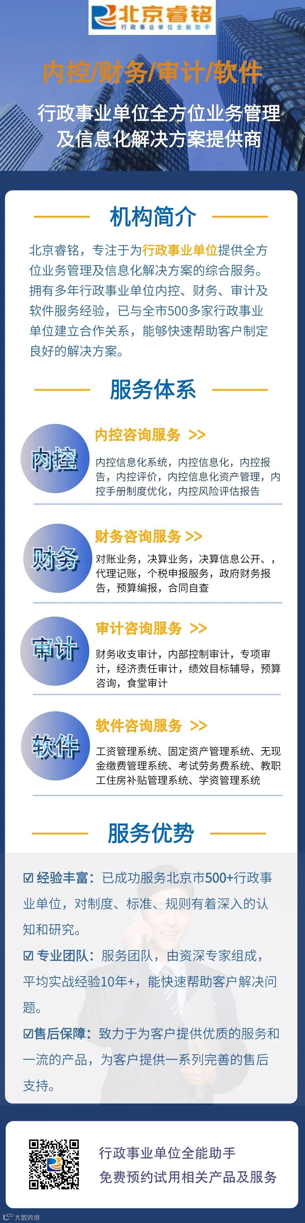 全方位业务管理及信息化解决方案提供商。专注于为政府部门、事业单位、非赢利组织提供内控、财务、审计、软件和法务相关的服务。