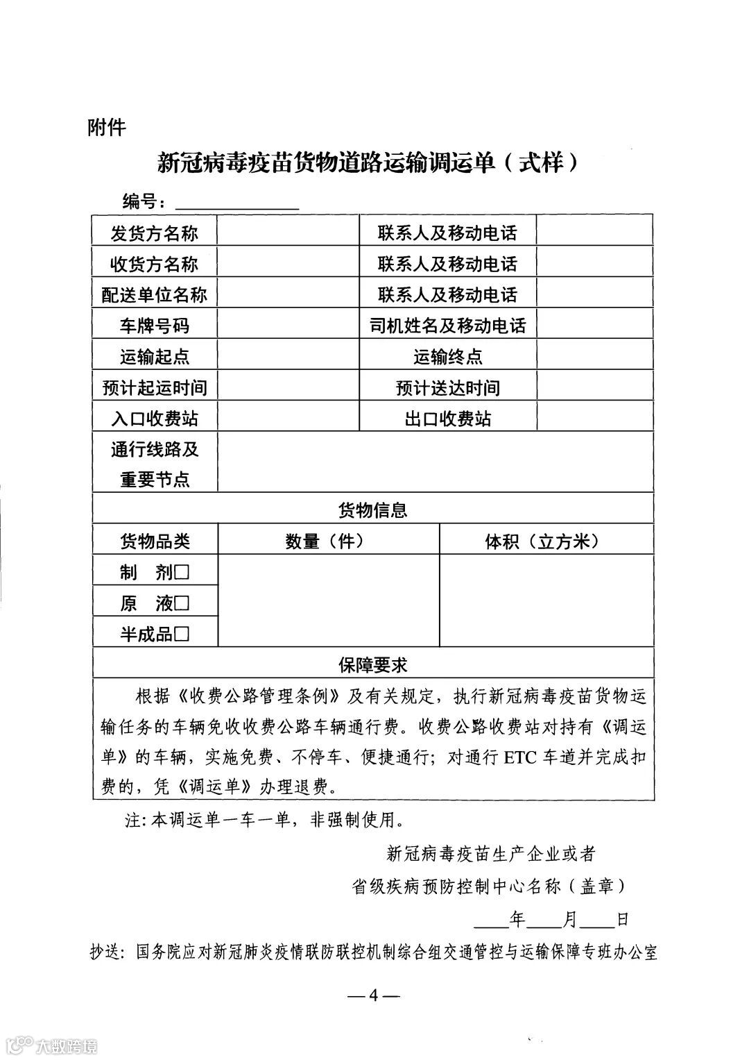 五、各省级交通运输主管部门要督促指导收费公路经营管理单位,加强收费站现场管理和疏导,确保疫苗货物运输车辆免费不停车便捷通行。