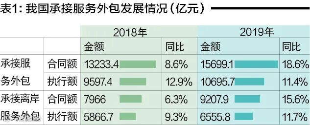 2019年我国企业承接服务外包合同额15699.1亿元,执行额10695.7亿元,同比分别增长18.6%和11.5%,执行额首次突破万亿元,再创历史新高,如表1所示。