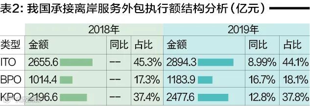 我国承接服务外包不仅升级ITO、BPO和KPO三大类型结构,各类型内部结构也向高端细分类型升级——2019年我国企业承接ITO主要领域是信息技术研发服务,执行额达2327.8亿元,占ITO执行总额80.4%;承接BPO主要领域是业务运营服务,执行额达763.8亿元,占BPO执行总额64.5%;承接KPO主要领域是设计服务,执行额达1574.2亿元,占KPO执行总额63.5%;特别是以医药和生物技术研发服务、检验检测服务、互联网营销推广服务、电子商务平台服务等为高端生产性服务外包更是快速增长,分别增长15.3%、20.5%、37.1%和53.2%。