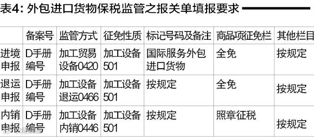 外包进口货物通关监管主要涉及进境申报、退运出境申报和内销补税申报,重点是报关单相关栏目填制的规范性,如表4所示。