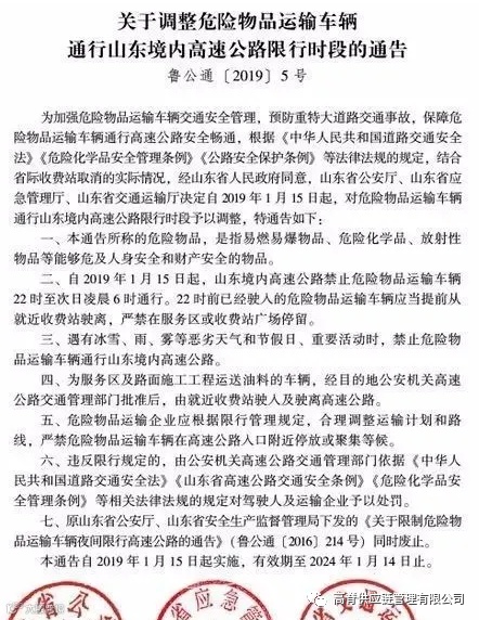 本通告自2019年1月15日起实施,有效期至2024年1月14日止。请广大危险物品运输企业合理调整运输计划和路线。