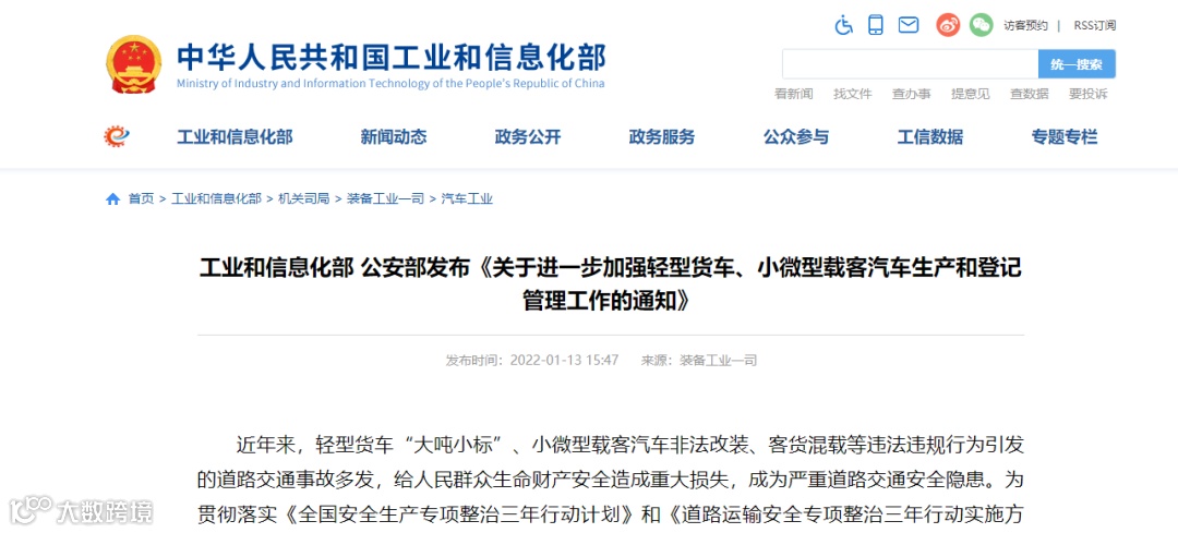 2022年1月13日,工业和信息化部及公安部发布《关于进一步加强轻型货车、小微型载客汽车生产和登记管理工作的通知》(下称“《通知》”)。