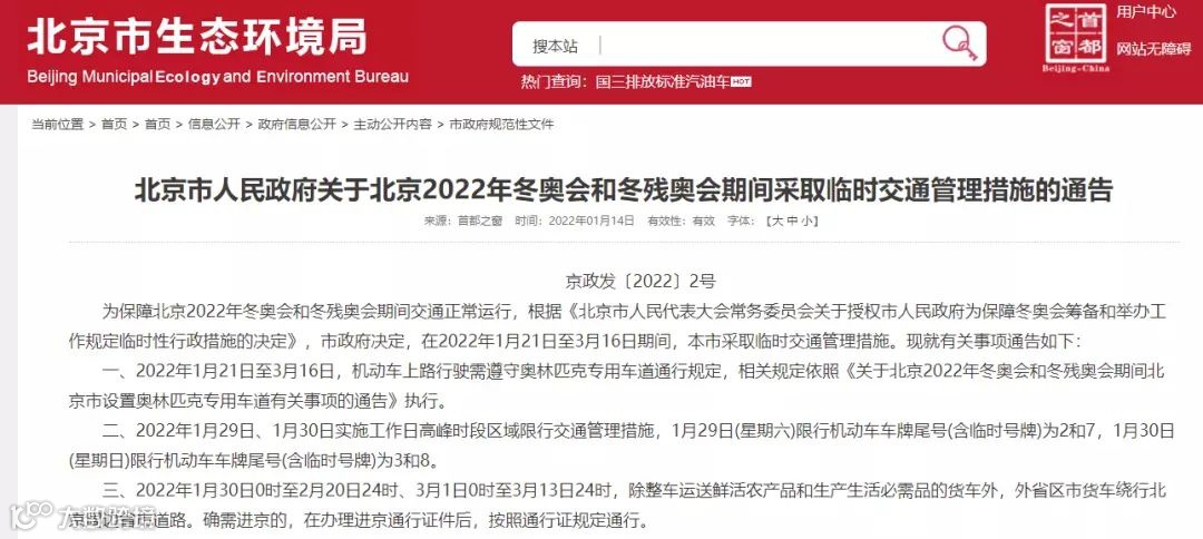 2022年1月14日,北京借鉴往届奥运会经验做法,制定临时交通管理措施。措施明确,在冬奥会期间,北京全天全市域禁止危化品车辆行驶;涉奥重要通道京礼、京藏高速分方向、分时段禁止4吨以上货车行驶;全天禁止建筑垃圾、渣土、砂石运输车辆上路行驶。保障期为2022年1月21日至3月16日,共计55天。
