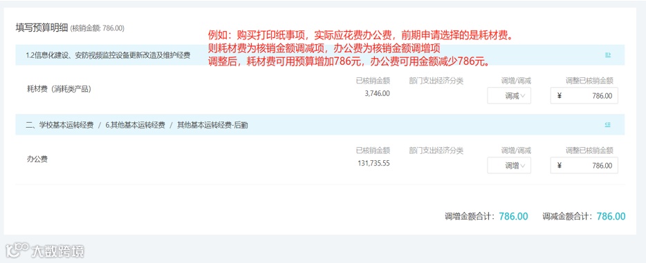 情景二:预算金额未到账,垫支使用预算。可以先用其他预算做申请,预算金额到账后进行核销调整。