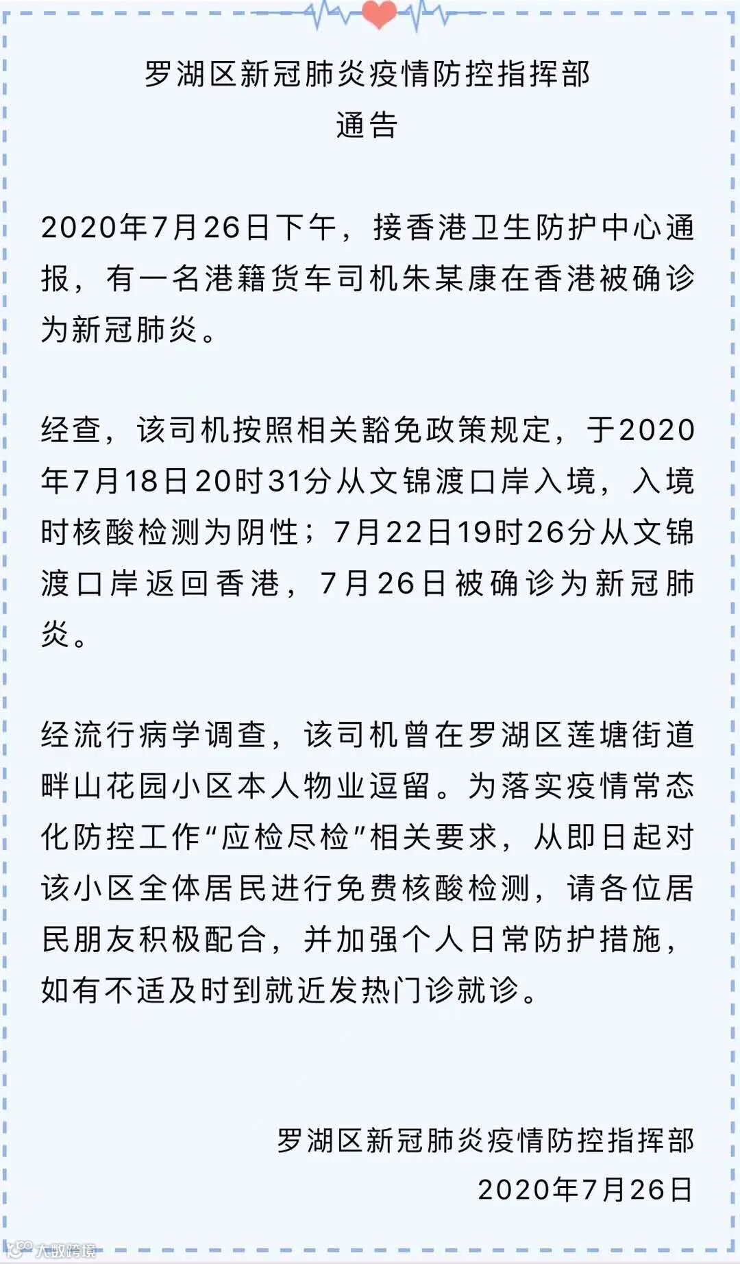 2020年7月26日下午,接香港卫生防护中心通报,有一名港籍货车司机朱某康在香港被确诊为新冠肺炎。
