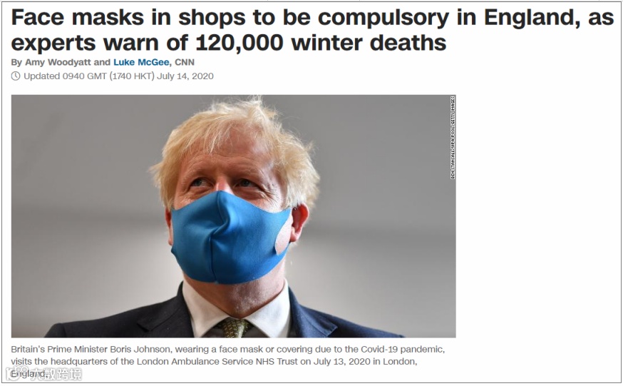 据报道,英国首相府于13日晚宣布,约翰逊宣布在英格兰商店或者超市购物的民众必须佩戴口罩。英国政府已经意识到新冠肺炎疫情严峻复杂程度,开始强制英国居民佩戴口罩。