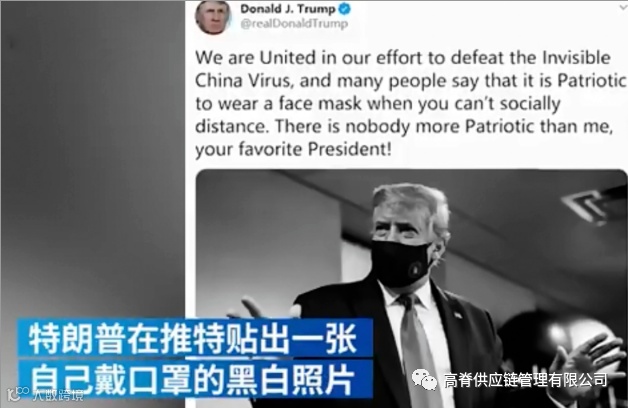 7月20日,特朗普在推特发布一张自己戴口罩的照片,表示戴口罩是“爱国行为”,称没有人比自己更爱国。美国疫情暴发数月以来,特朗普7月11日才首次在公共场合戴口罩。