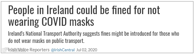爱尔兰规定,从7月13日起人们乘坐公共交通工具必须戴口罩,违规者将面临2500欧元罚金或半年徒刑。