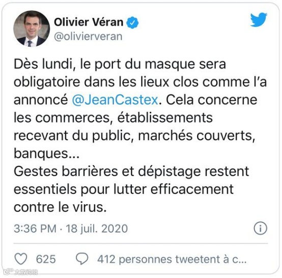 法国卫生部长韦兰当地时间7月18日表示,将从7月20日起在所有室内公共场所强制佩戴口罩,其中主要包括商店、公共接待场所、室内市场以及银行等。