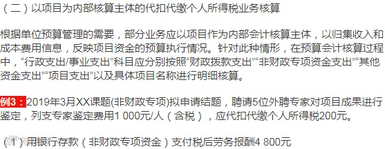 例6:承例3,XX项目业务发生后,代扣个人所得税200元,用银行存款(非财政专项资金)支付税后劳务费4 800元。