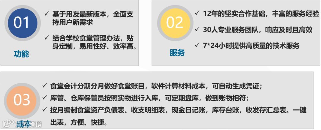 我们会为您定制一整套学校食堂的完整实施解决方案,包括从食堂原材料的分类、存货核算的计价方式,再到供应商档案管理,以及财务的会计科目的设定,和最终所要出具的食堂财务报表等全方位一系列服务帮助。