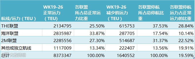 第19到26周,停航导致的运力减少比重约为19.6%。从正常运力情况来看,各船公司在亚洲-北欧航线投入的运力最多,其次是美西航线。同时北欧航线停航比重在四个航次中也是最高的,其次是地中海航线。
