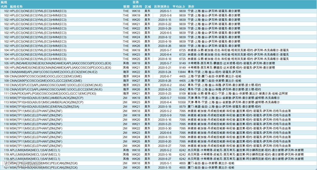 其中,停航的167条航线中有66条航线属于季节性停航。截至5月9日,THE联盟停航34条航线,海洋联盟停航24条航线,2M停航25条航线,其他或独立航线停航22条航线,分别占5月停航数量的32%、23%、24%、21%。
