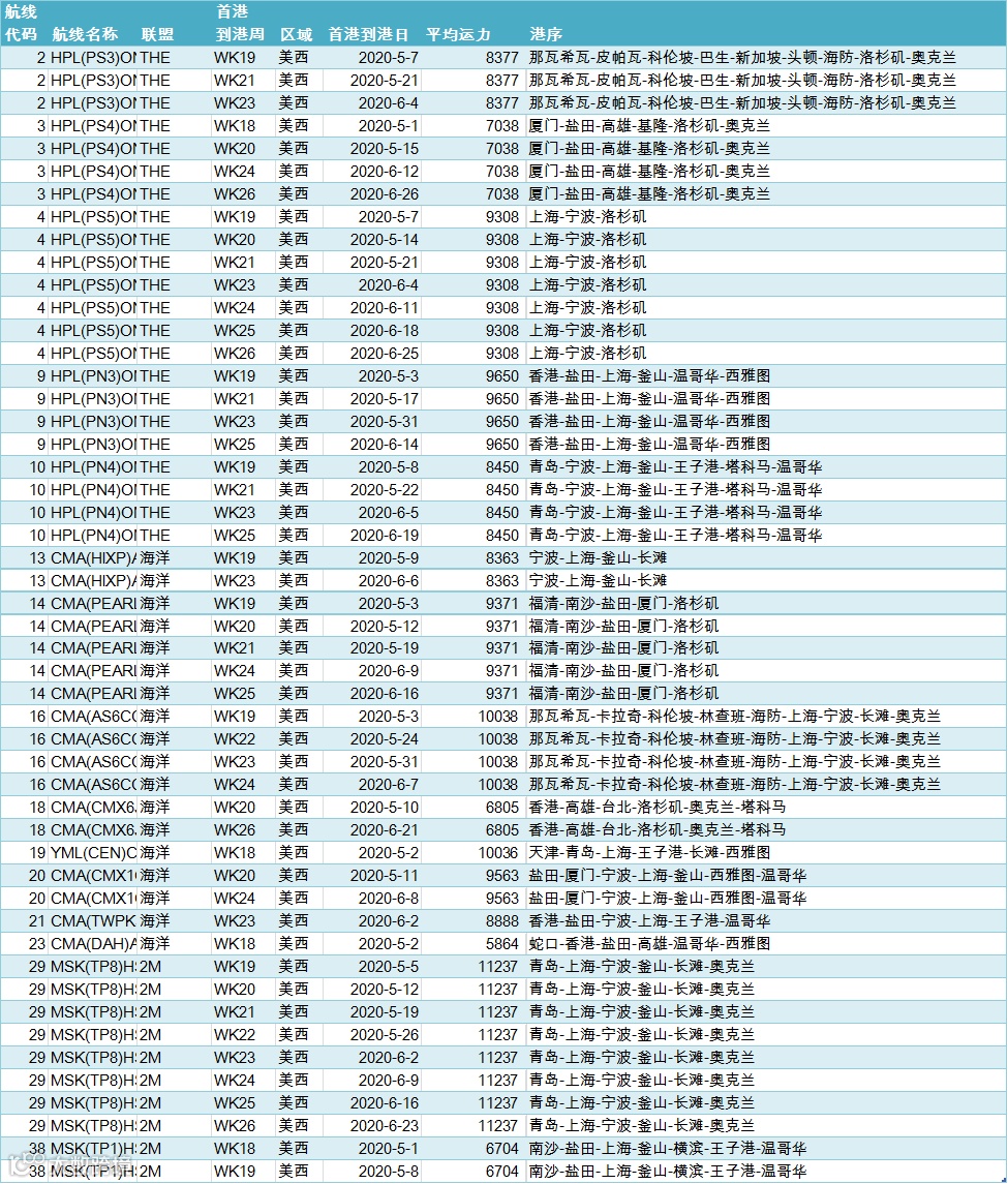 韩国釜山港正常靠港频率为296次,停航62航次,占比21%;新加坡正常靠港频率232次,停航37频次,占比16%。