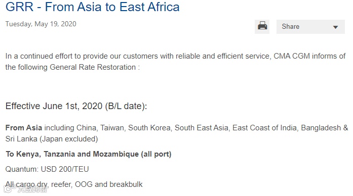 达飞于6月1日起从亚洲到东非收取GRR,标准为200美元/箱