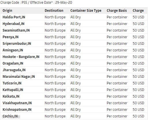 从2020年5月29日起,对从印度南部和东部所有港口,到欧洲北部和南部国家的所有干集装箱货物征收旺季附加费(PSS)