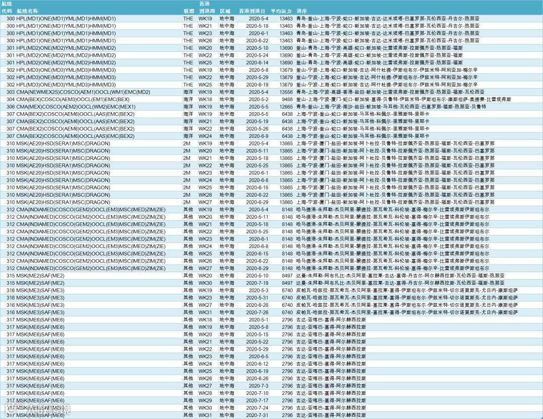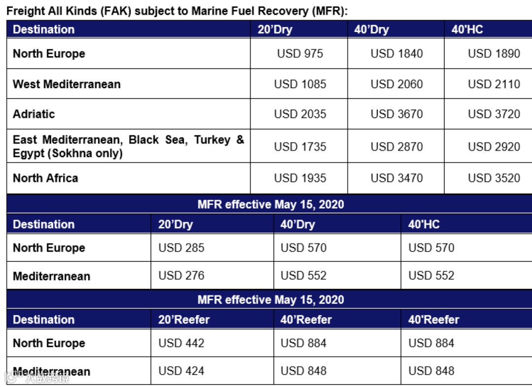 东亚到北欧和地中海FAK费率调整:自2020年6月1日起生效,直至另行通知为止,东亚(包括日本)的Hapag-Lloyd海运费率如下: