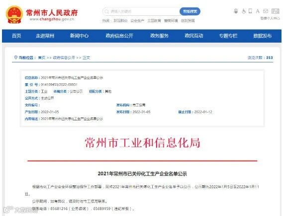近日,江苏省常州市工业和信息化局公示2021年常州市已关停江苏嘉仁禾科技有限公司等46家化工生产企业名单。