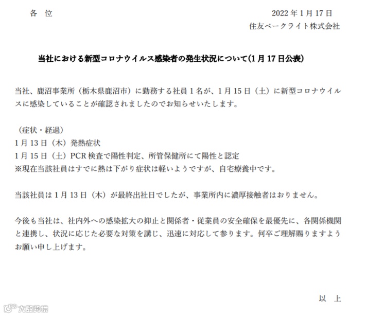 1月17日,住友化学另一家子公司住友电木宣布其鹿沼工厂(栃木县鹿沼市)1名员工确诊新型冠状病毒。所幸公告称该员工的最后一天工作是1月13日,目前尚没有发现密切接触者。