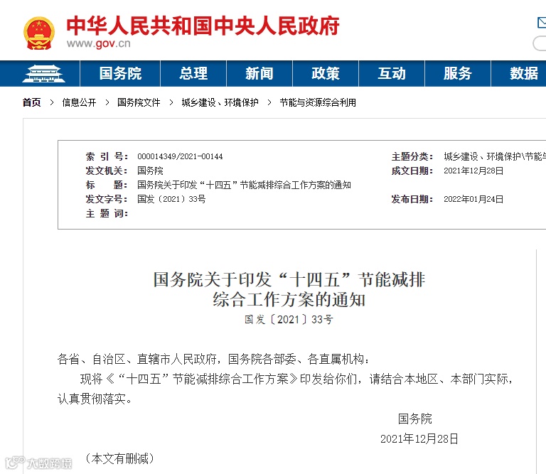 据国务院官网显示,1月24日发布关于印发“十四五”节能减排综合工作方案的通知。方案中明确指出,为促进碳达峰、碳中和工作推进,将大力推动节能减排,深入打好污染防治攻坚战。(《方案》全文请您点击文章左下方“阅读原文”查看)