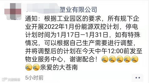 此外,近期温州一塑料企业表示,因2022年1月能耗双控影响,公司所在的工业园区计划在1月17日-1月31日停电,也就是说春节假期后,将会限电停产15天!