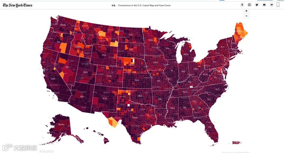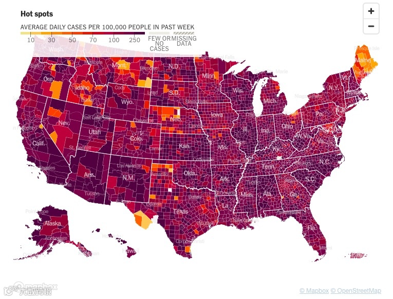 这是来自纽约时报发布的一张疫情地图。根据这张疫情地图的定义,在过去一周,每十万人中的日均新增确诊数由低到高依次由黄色渐变到橘色,再到红色,最后到深紫色。