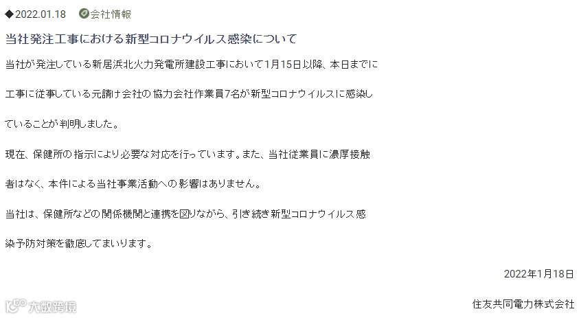 1月18日,住友化学子公司住友共同电力称从1月15日起公司新居浜北火力发电站的建设工作中,一家正在和公司合作的从事建筑施工的总承包商的7名工人感染了新型冠状病毒。