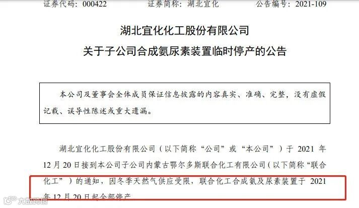 早在一个月前,国内化肥巨头湖北宜化集团发布公告宣布因能耗双控停产!公告显示:于2021年12月20日接到其子公司内蒙古鄂尔多斯联合化工有限公司的通知,因冬季天然气供应受限,联合化工合成氨及尿素装置于2021年12月20日起全部停产。