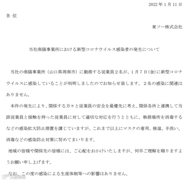 1月24日,东曹株式会社发公告称其南洋工厂(位于日本山口县周南市)再次发现1名员工不幸感染新冠病毒,目前累计确诊员工达3名。