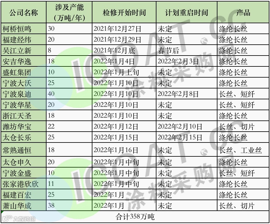 尽管2022开年不足一个月,但已有部分化工企业开启了停车检修的进程,涉及产量累计超过1000万吨。值得注意的是,春节期间聚酯装置检修涉及长丝产能358万吨。