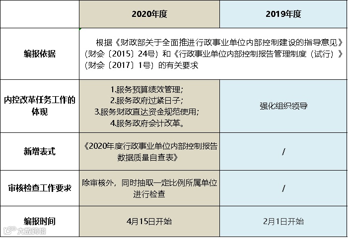 近日,财政部发布《关于开展2020年度行政事业单位内部控制报告编报工作的通知》(财会〔2021〕6号),正式启动2021年内部控制编报工作。我们及时整理了2021年编报通知的相关重点,以及与上年通知和报告的差异,供接下来参与编报的小伙伴们参考。